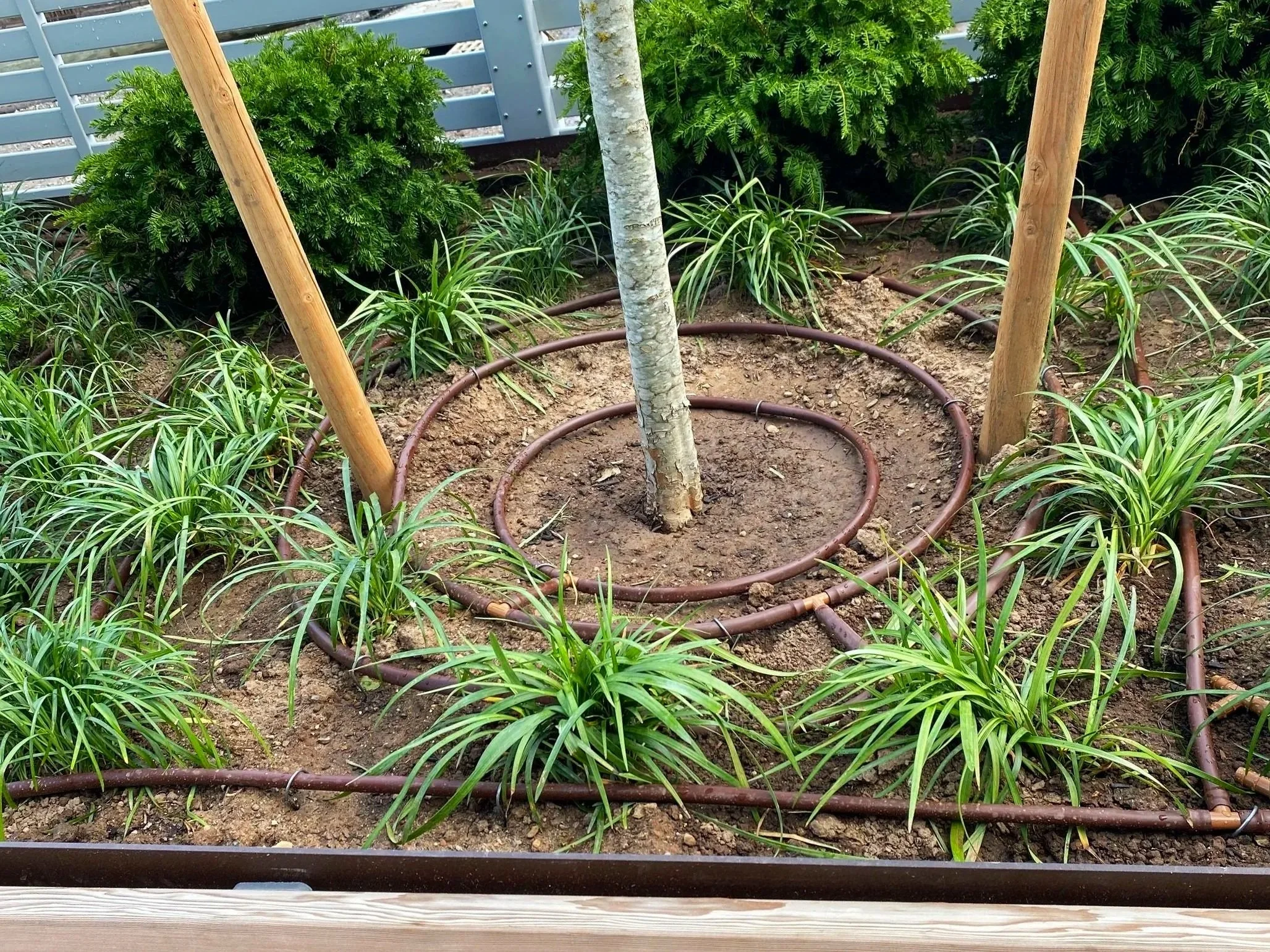 Flowerpot irrigation uses micro tubing to deliver controlled watering directly into each planter, often routed discreetly through columns or structures. This system provides consistent, low-maintenance watering while keeping the installation hidden.